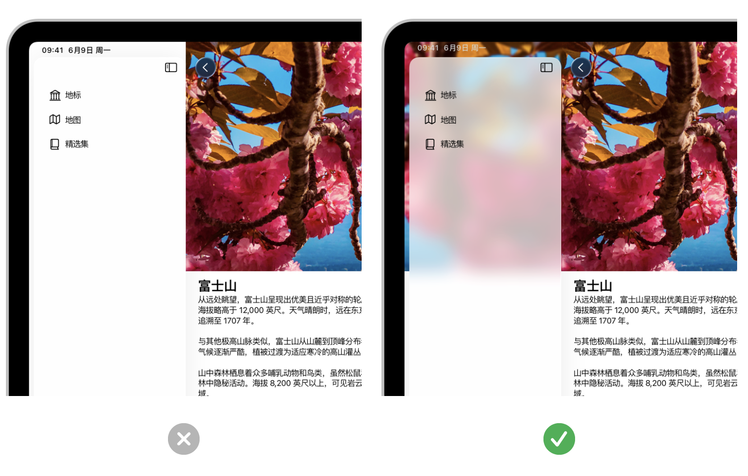 延伸边栏下方的内容。在 iOS、iPadOS 和 macOS 中,与工具栏和标签页栏等其他控制一样,边栏会悬浮于内容之上的 Liquid Glass 层。若要强化边栏的分离和悬浮外观,请使其水平滚动或者应用背景延伸视图来将内容延伸至其下方,该视图会镜像邻近的内容,给人一种将内容拉伸到边栏下方的感觉。