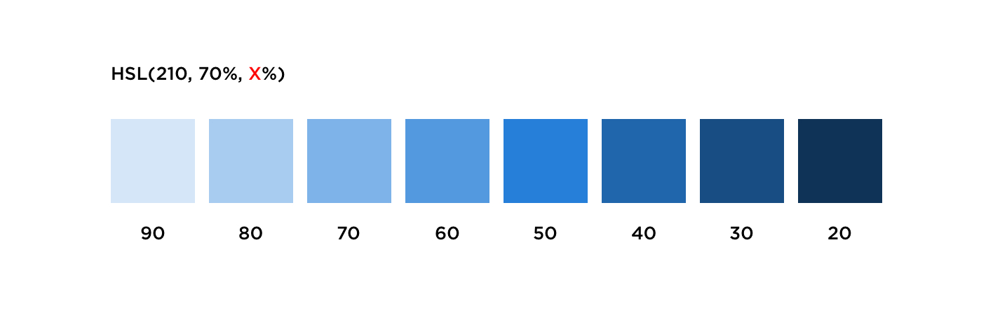 明度(Lightness / Value),可以先简单理解成:这个颜色在画面里,看起来有多亮、多暗。当你在工具里把同一个蓝色的明度从高往低拖,你会看到一个很直观的变化: