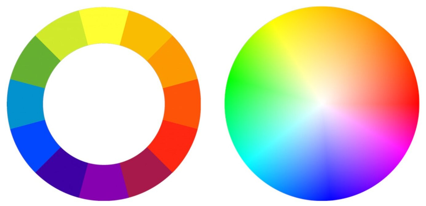 在这个圆环上移动,就是色相在工作。很重要的一点是,色相是「环形」而不是「直线」。这意味着两个色相之间的关系,既有「距离」也有「方向」。