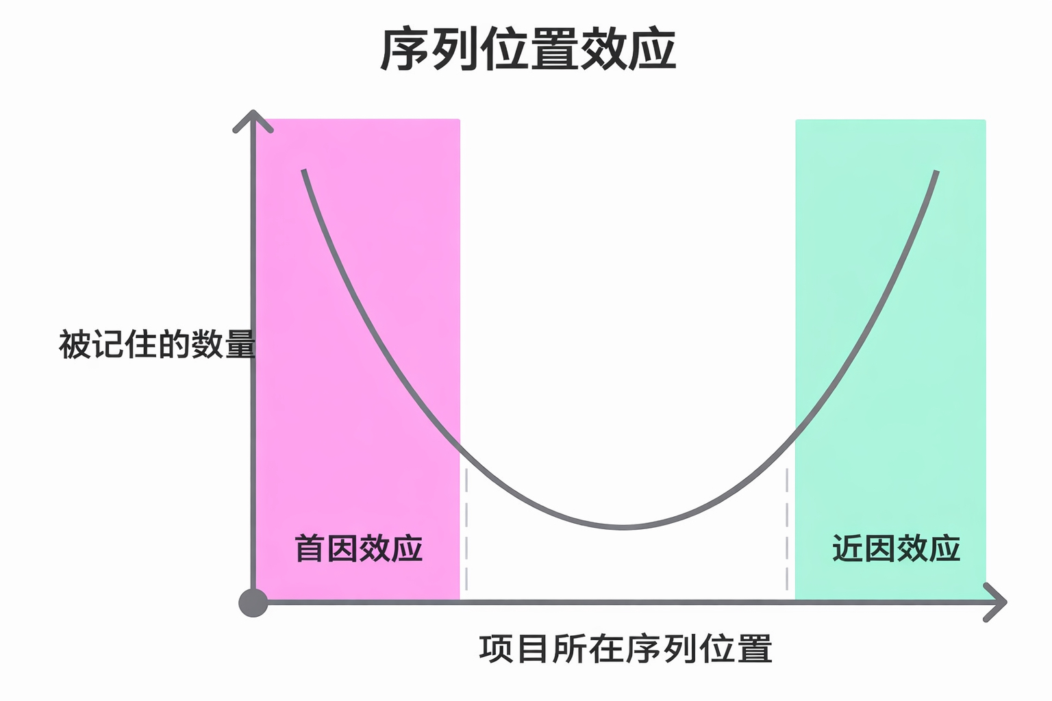 人类记忆可以被看做是一种近似 U 形的回忆曲线:开头部分的项目回忆率较高,中段明显下降,末尾又重新上升,前端的优势被称为首因效应(Primacy),末端的优势被称为近因效应(Recency)。