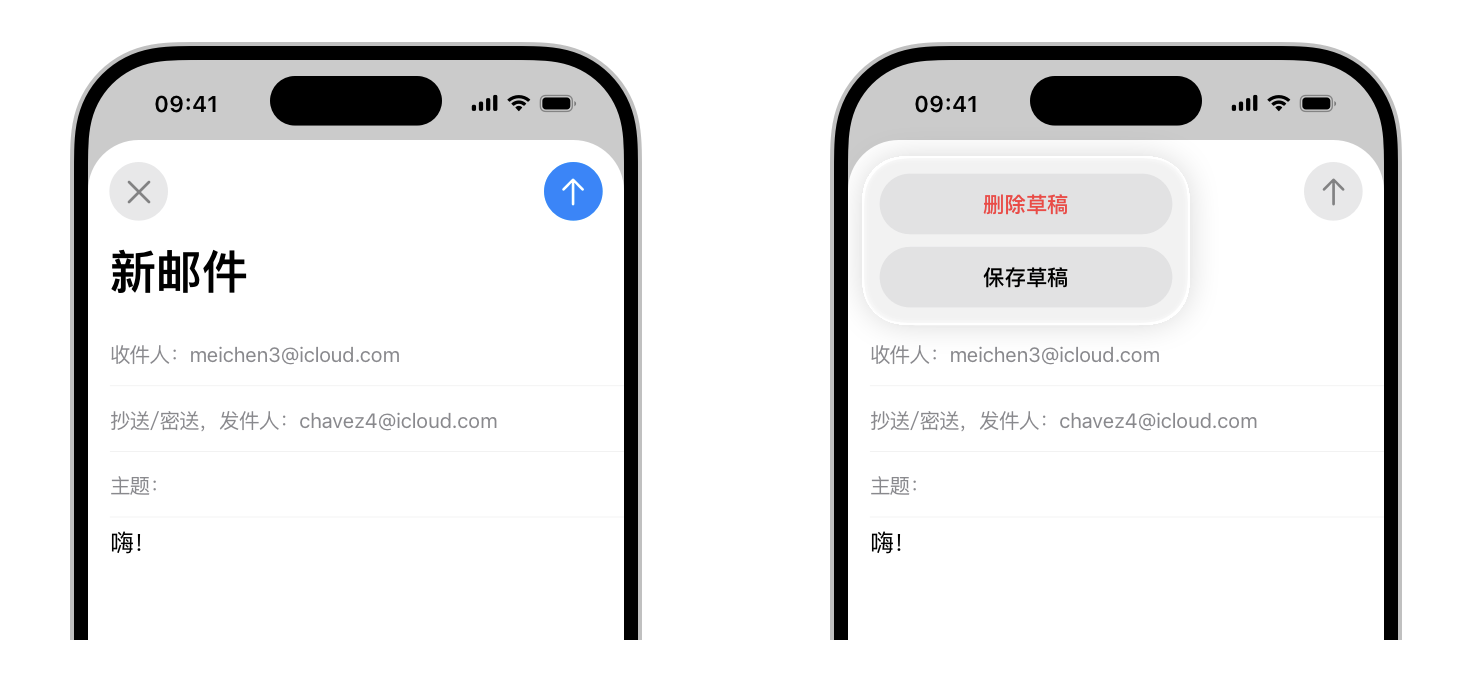 使用操作表单而非提醒来提供特意操作相关的选项。例如,当用户在 iPhone 上的“邮件”中取消编辑的邮件时,操作表单会提供两个选项:删除草稿或保存草稿。尽管提醒也可以帮助用户确认或取消带来破坏性后果的操作,但它不提供与该操作相关的附加选项。更重要的是,提醒通常是非预期的,一般告诉用户当前情境中出现问题或变化,并可能需要他们采取行动。有关指南,请参阅提醒。