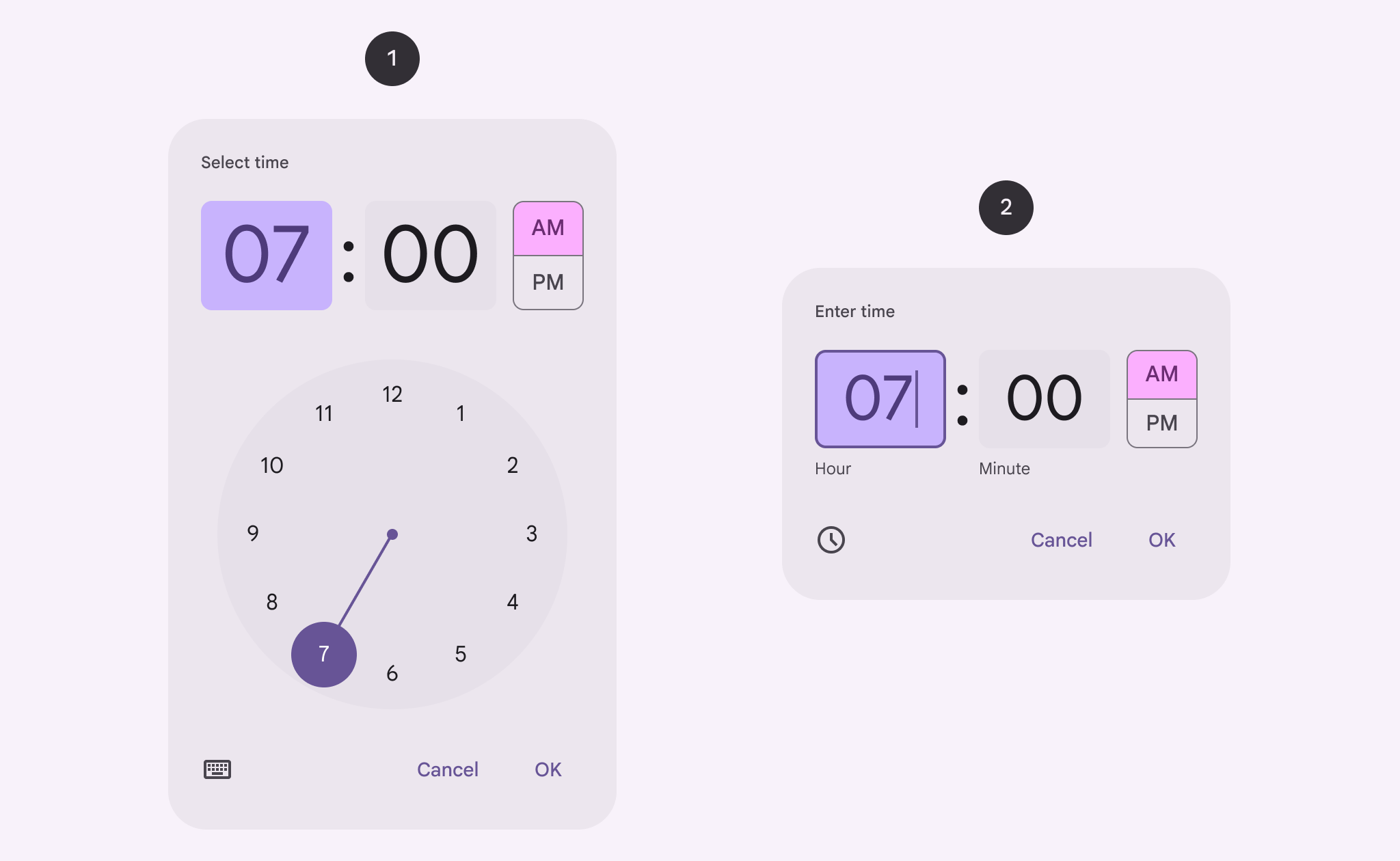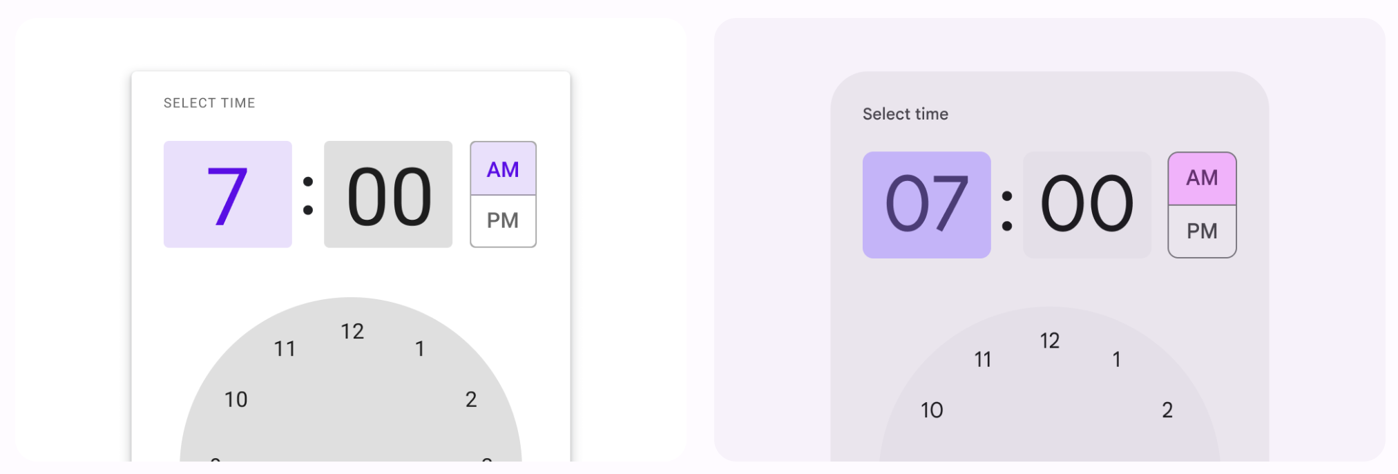M3(右图):时间选择器采用兼容动态颜色(dynamic color)的新颜色映射
