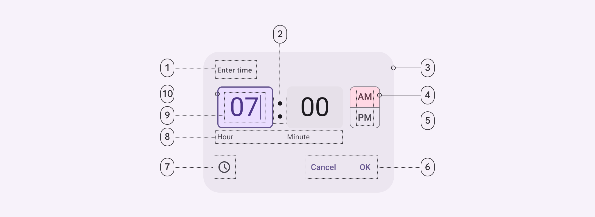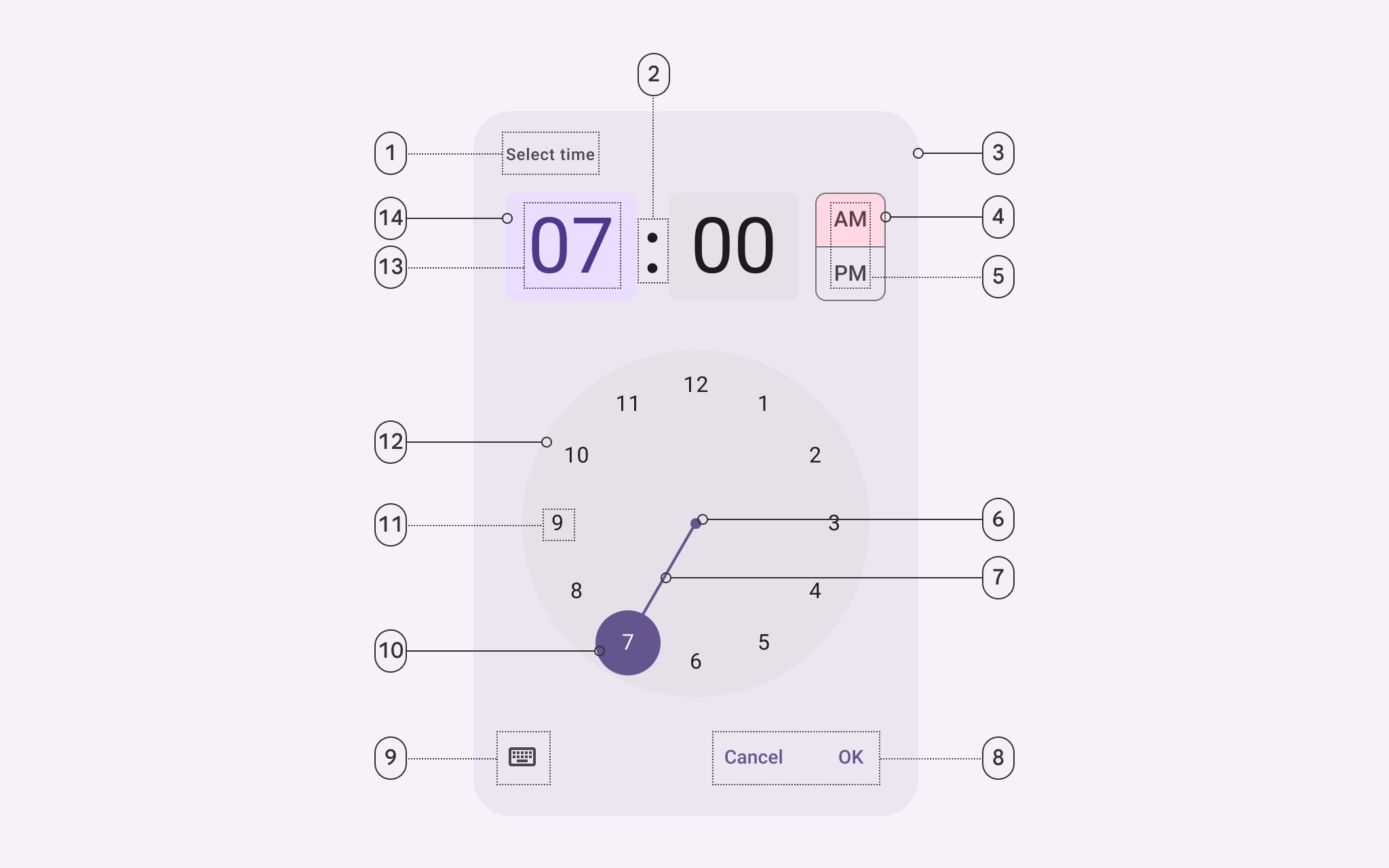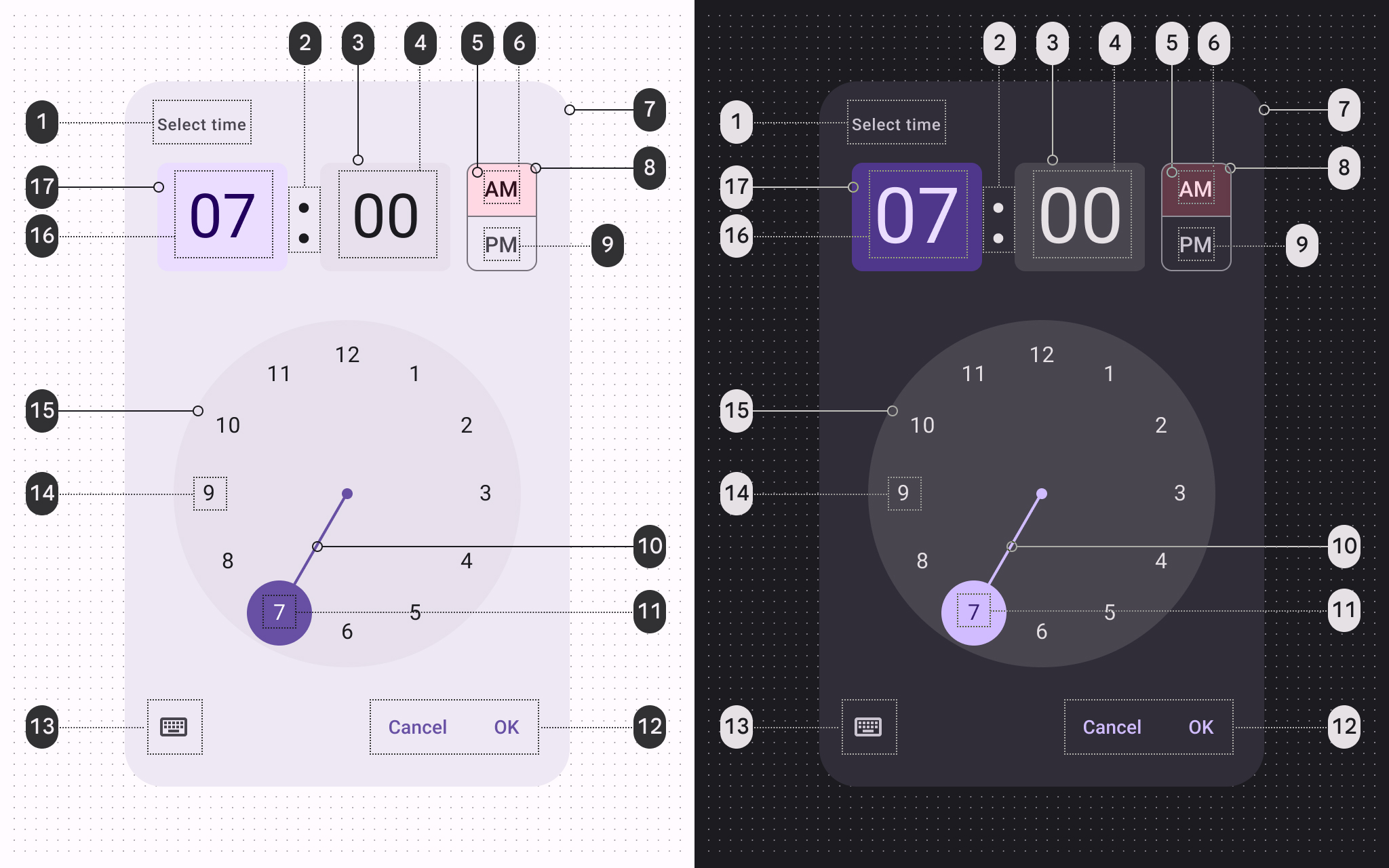 用于浅色与深色主题的时间选择器表盘颜色角色: