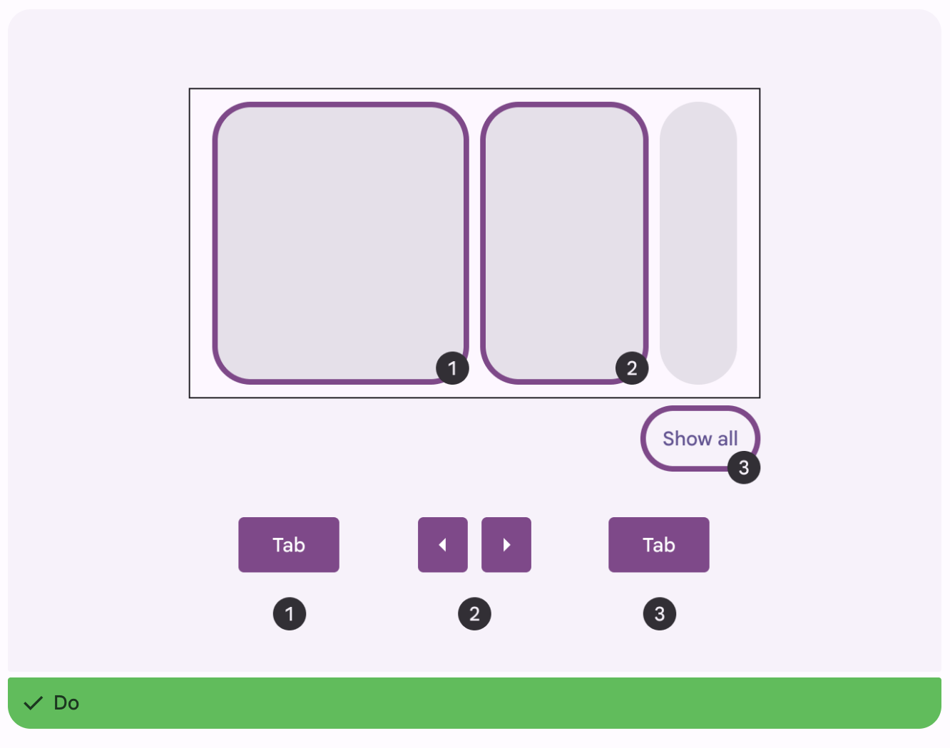 在可能的情况下,避免自定义无障碍解决方案。不过,如果你的产品需要替代方案,可以考虑在附近的导航中添加“查看全部”(Show all)按钮,或在轮播附近添加替代控制按钮。