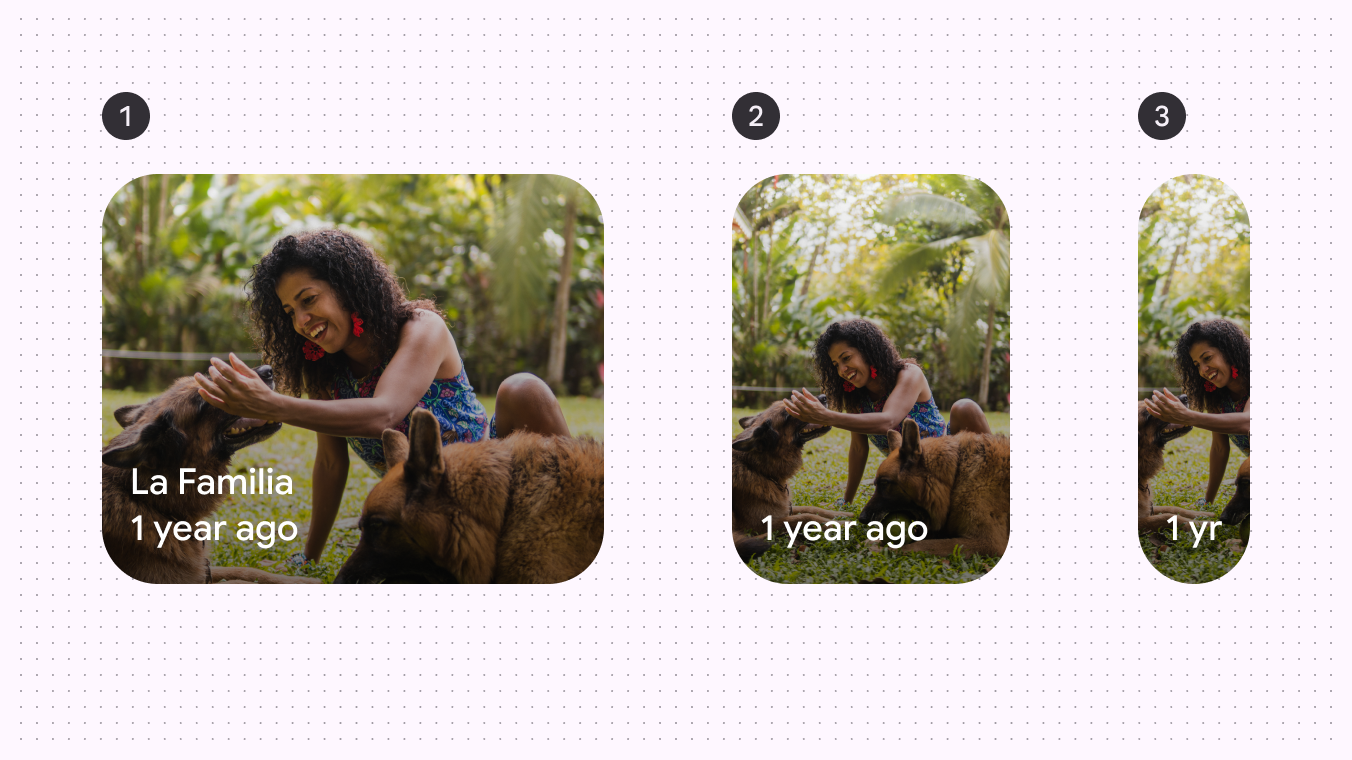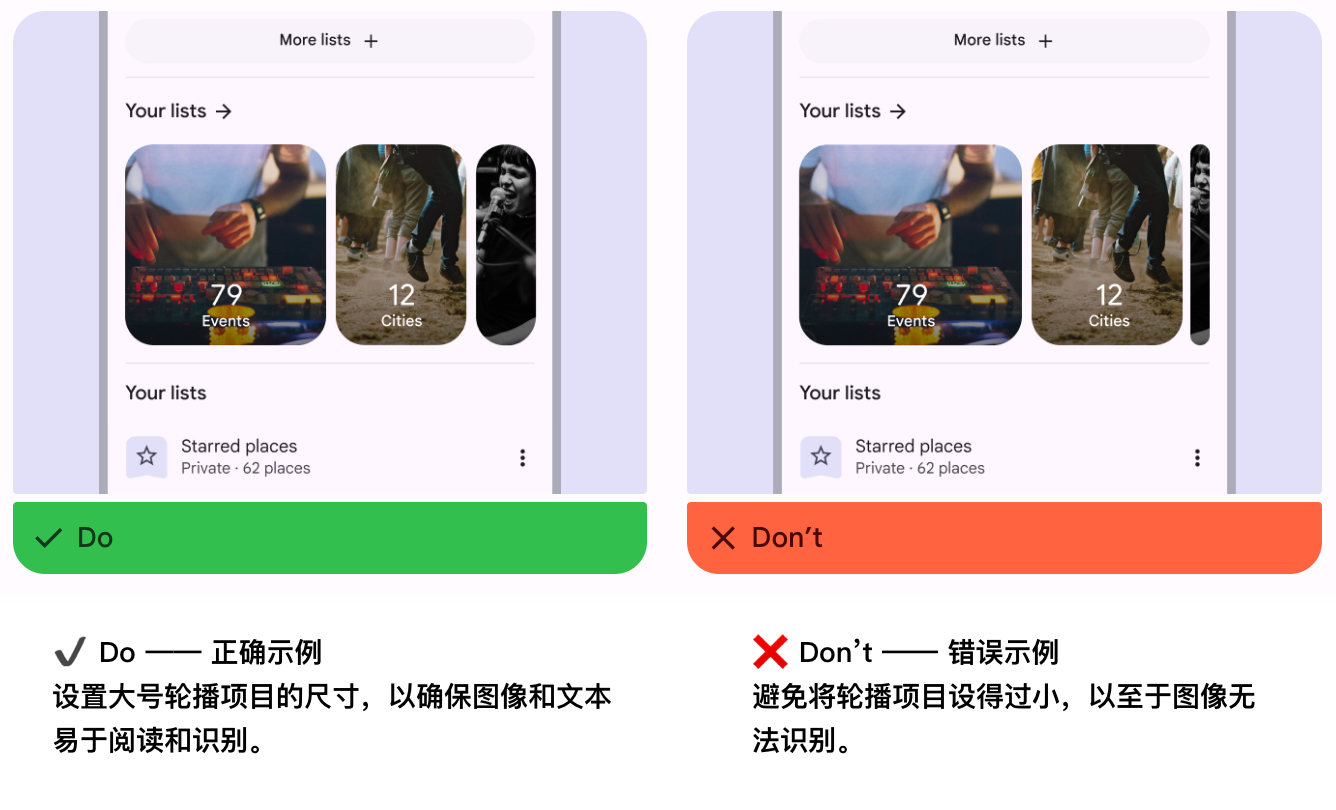 文本在每种尺寸下都应始终易于理解。考虑在较小的轮播项目上,将文本适配为简短标签。
