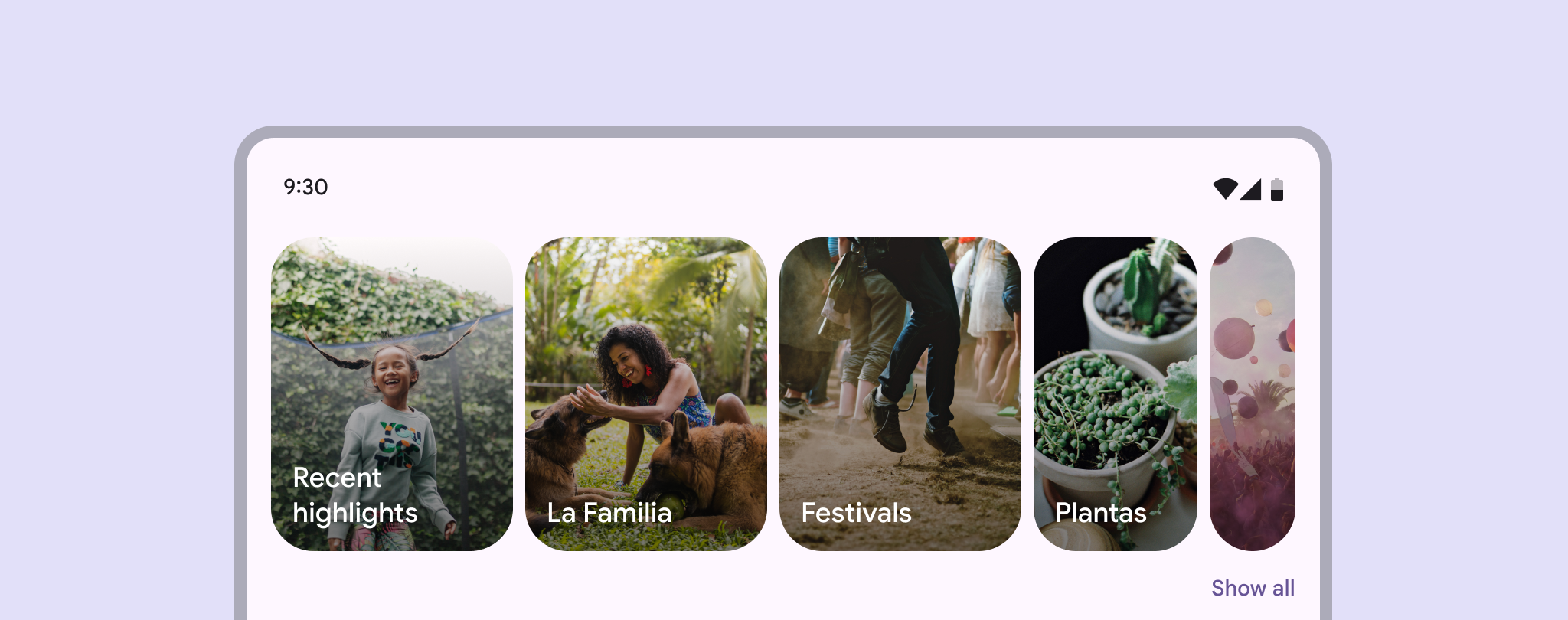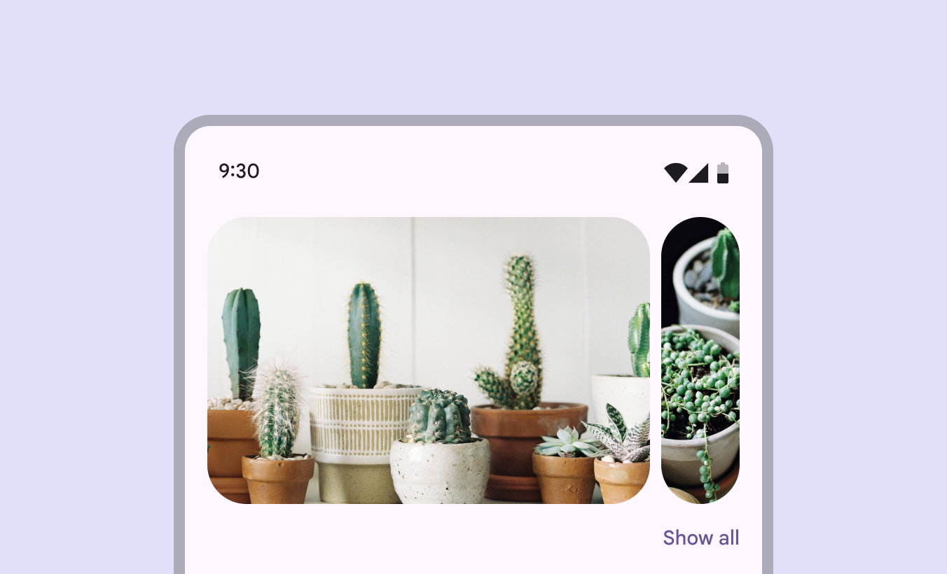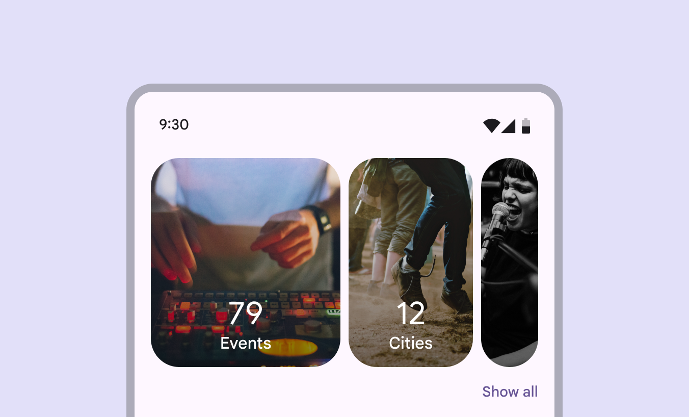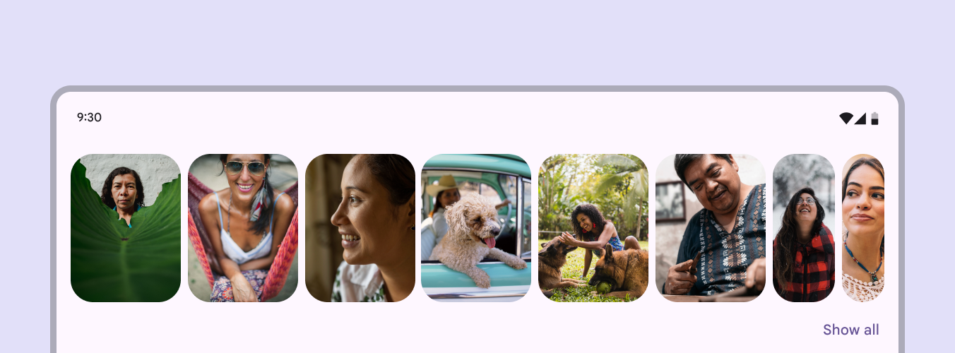 Material 建议在轮播下方添加一个“查看全部”(Show all)按钮,用于打开一个专门的纵向滚动页面,展示所有轮播项目。