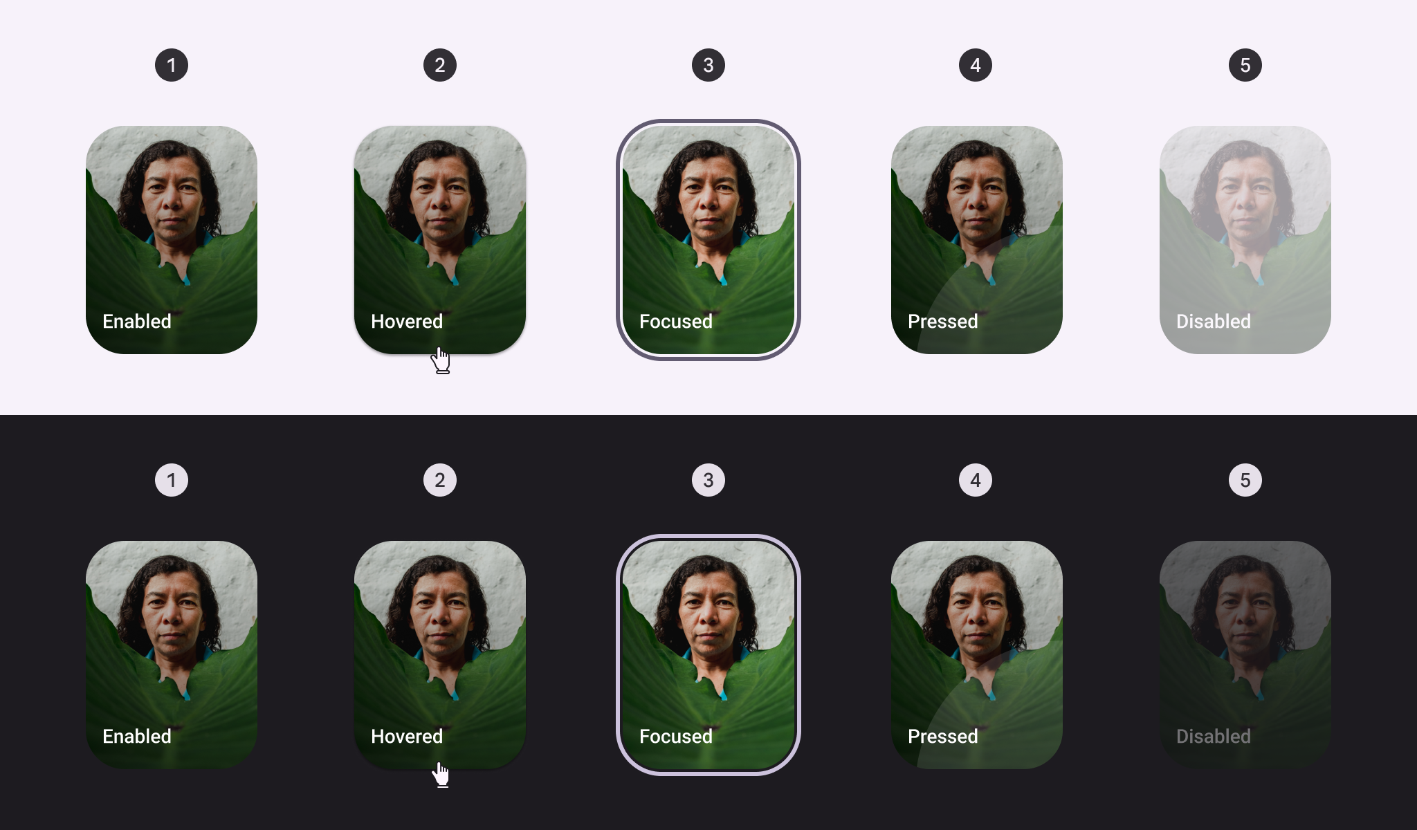 悬停状态(hover state)会提供一个视觉线索,表明轮播项目是可交互的。当轮播项目被点击时(无论处于激活或未激活状态),都会出现涟漪(ripple)作为交互反馈。