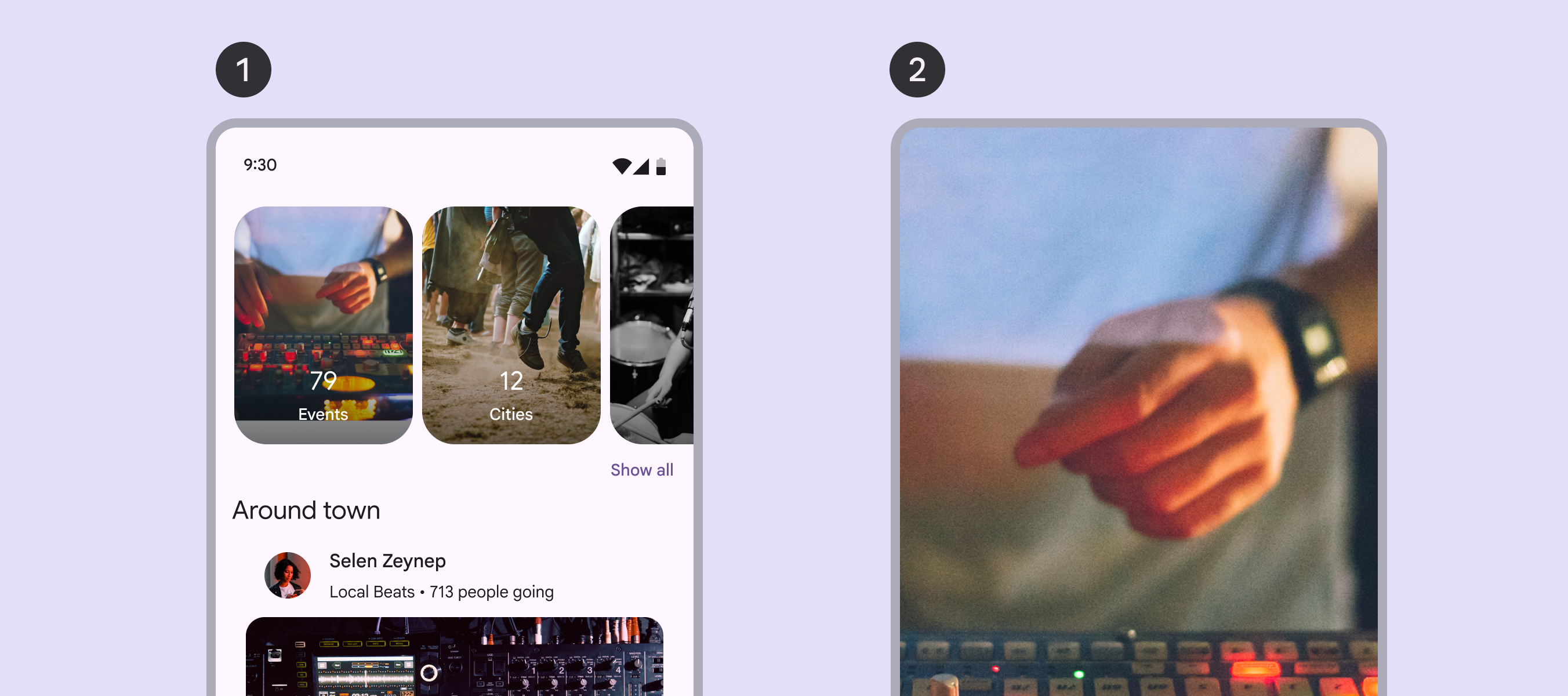 全屏布局最适合用于沉浸式体验,例如视频文章、精选标题,或视觉内容很丰富的项目。它可以在图片之上包含文本和其他 UI 元素。
