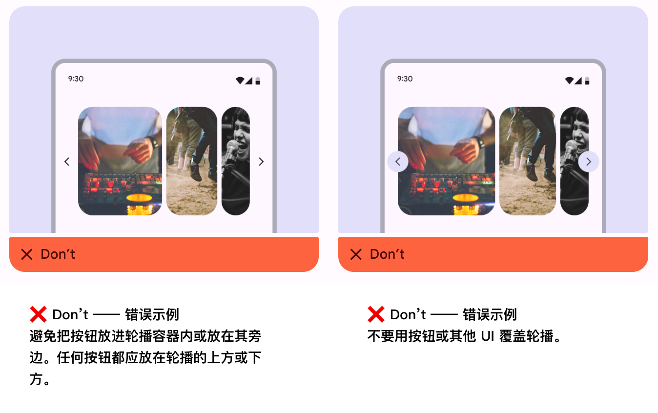 避免在轮播内部或旁边添加 UI 元素,例如箭头或其他图标。
