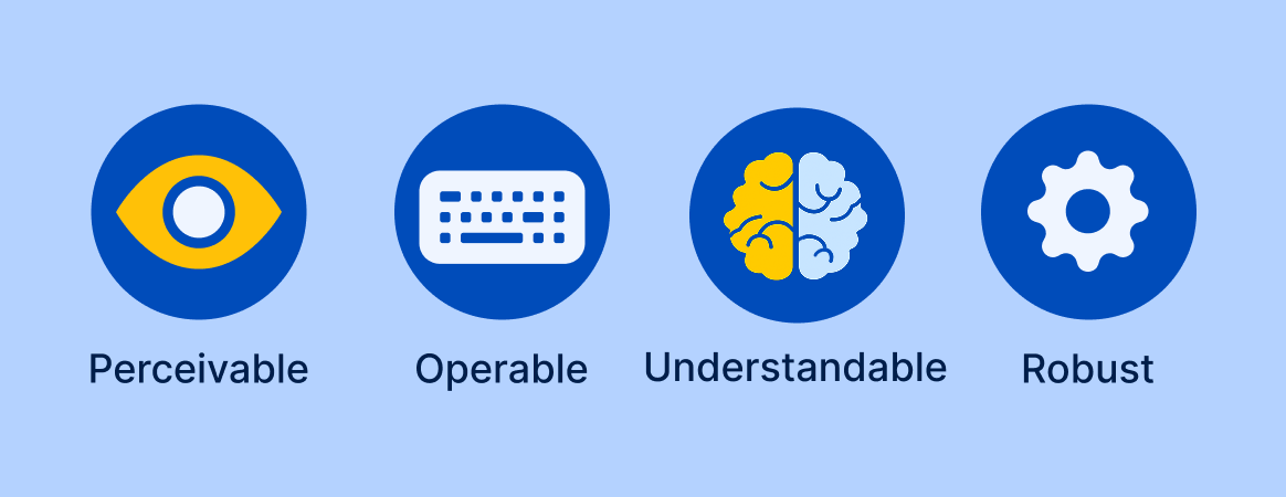 所以 WCAG 先把这些中断按归因分成四类,并把它们写成四条最重要的原则—— POUR。POUR 是四个英文词的首字母缩写,对应四条原则: