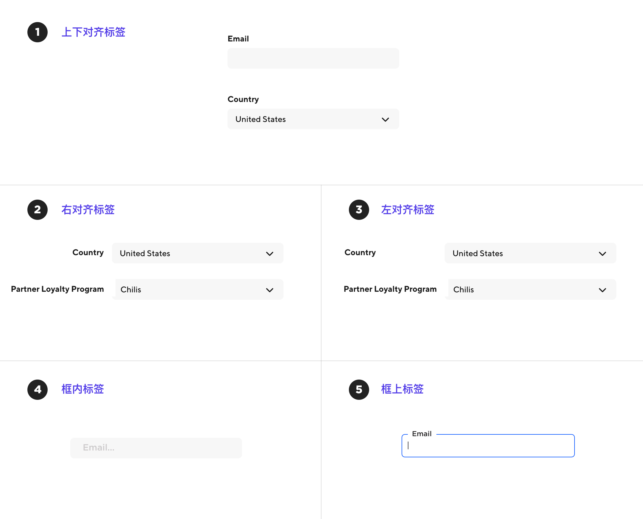 在表单设计中,标签和输入框总是成对出现,但受屏幕宽度、语言长度、多设备适配等客观条件限制,二者的空间关系可以有多种安排。常见的五种结构是