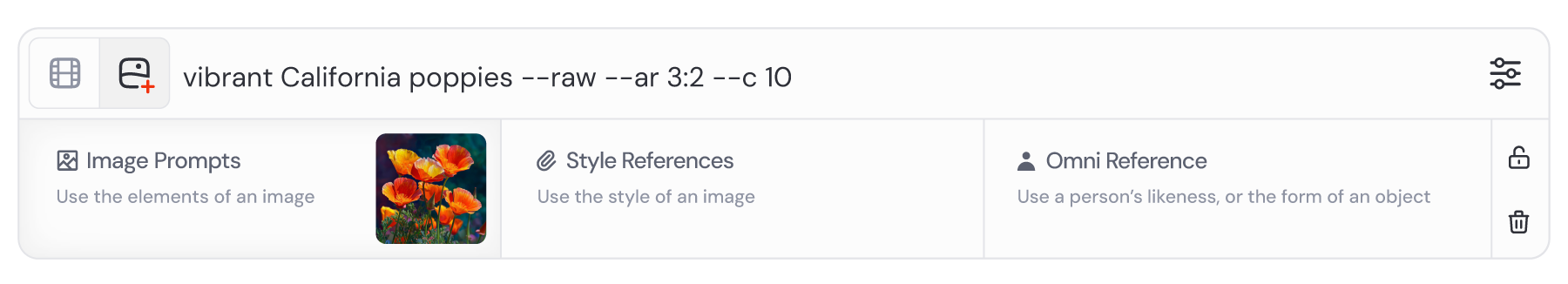 当你熟悉了基础提示词后,可以开始探索更高级的用法!你可以添加一个或多个图像提示(Image Prompts)、使用多段文字提示,并应用称为参数(Parameters)的工具。这些功能能让你创作出更复杂或更具针对性的图像。尝试混合不同元素,激发你的创造力吧!