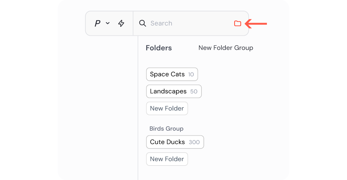 当你进入 Create 页面时,会在顶部搜索栏旁看到一个 文件夹按钮,点击该按钮后,你的所有 文件夹(Folders) 与 文件夹组(Folder Groups) 都会展开显示。