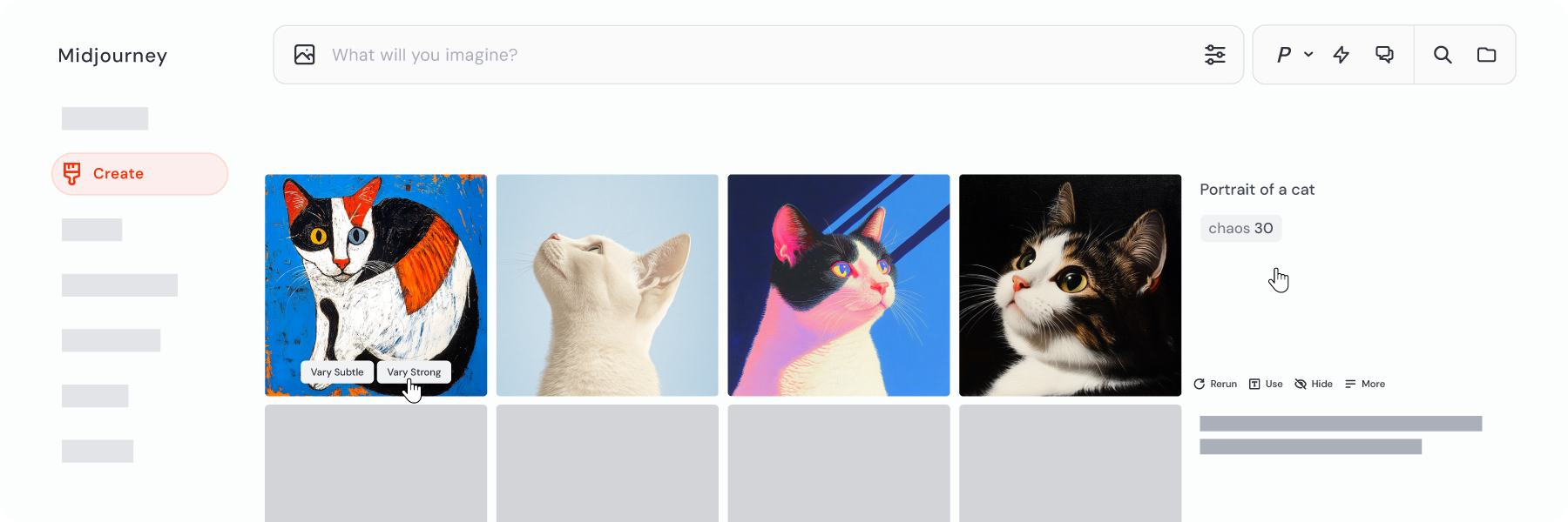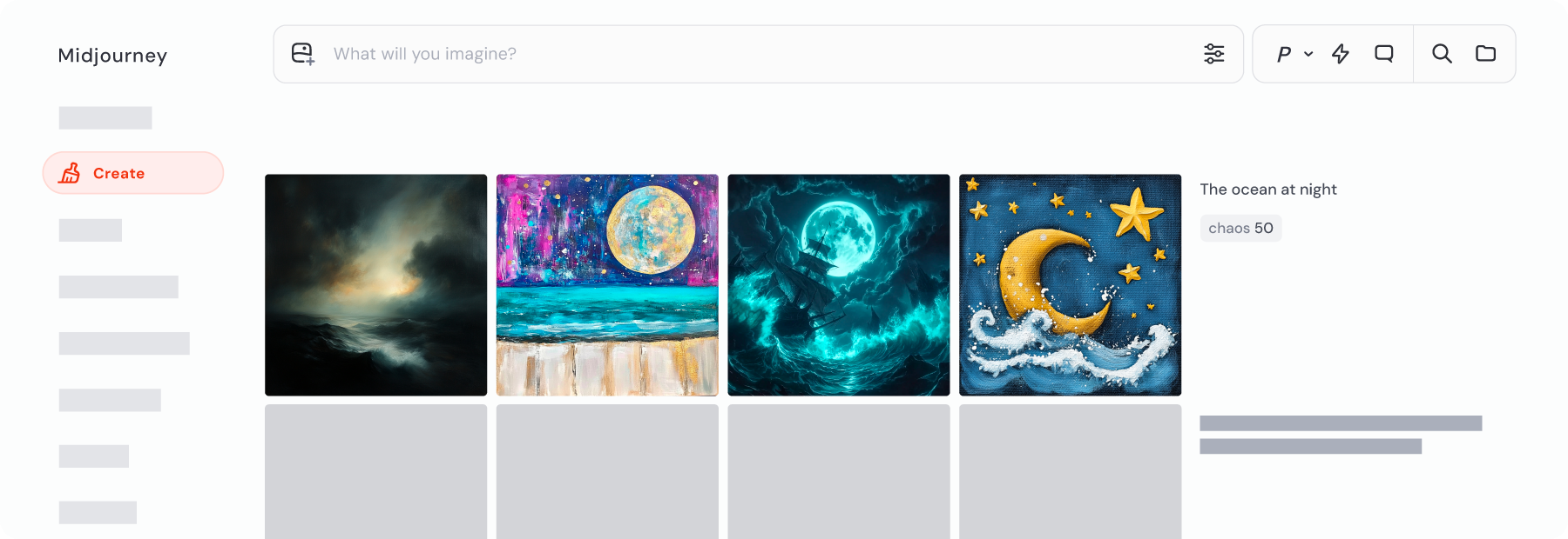 欢迎来到 midjourney.com 的 Create 页面 ——这是你生成精彩图像的核心工作区!虽然你可以在网站的很多页面使用 Imagine 输入栏,但 Create 页面 是唯一能让你实时观看图像生成全过程的地方。