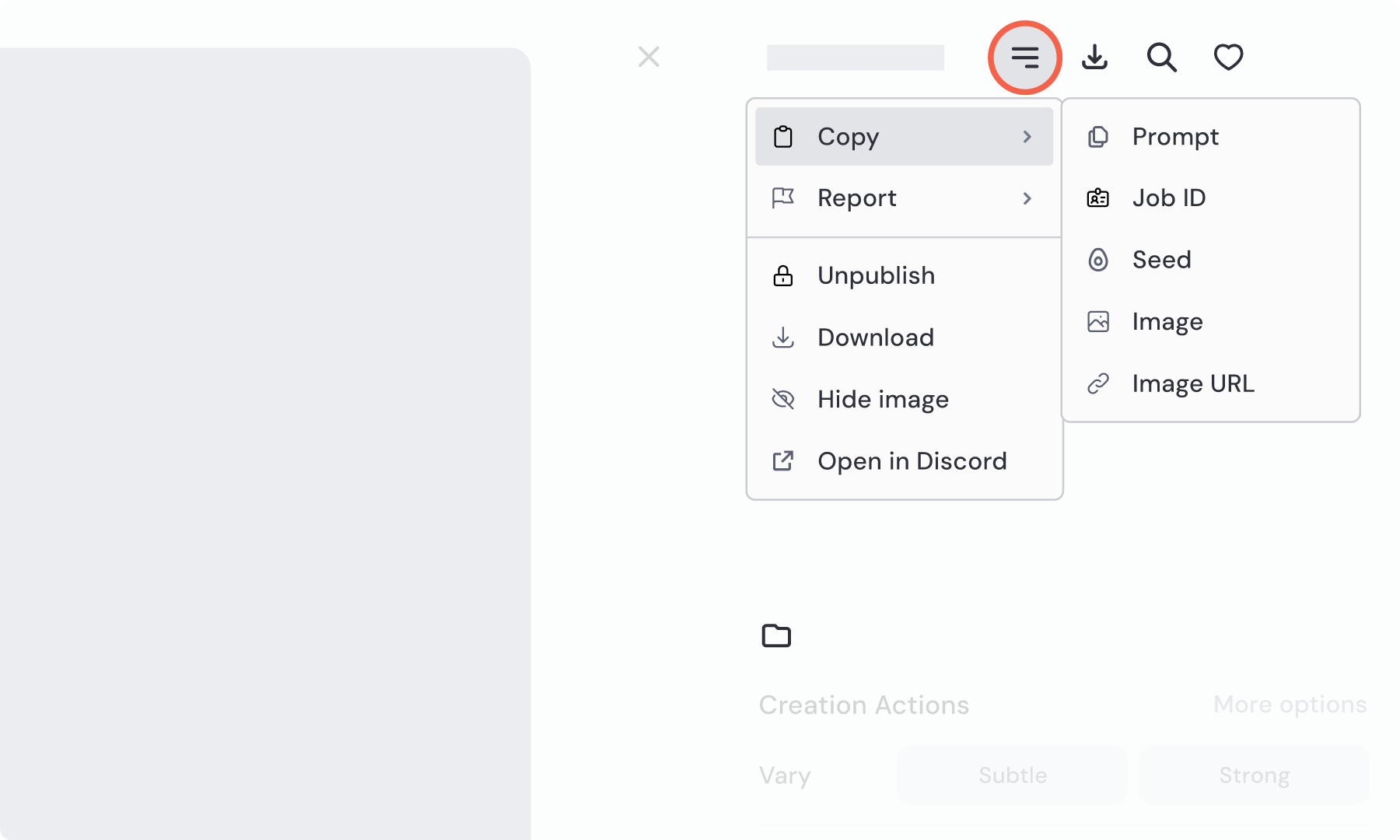 你可以对违反社区规范的图像进行举报,也可以选择 发布/取消发布、下载、隐藏/取消隐藏 该图像,如果图像最初是在 Discord 中生成,还可以一键返回 Discord 中查看。